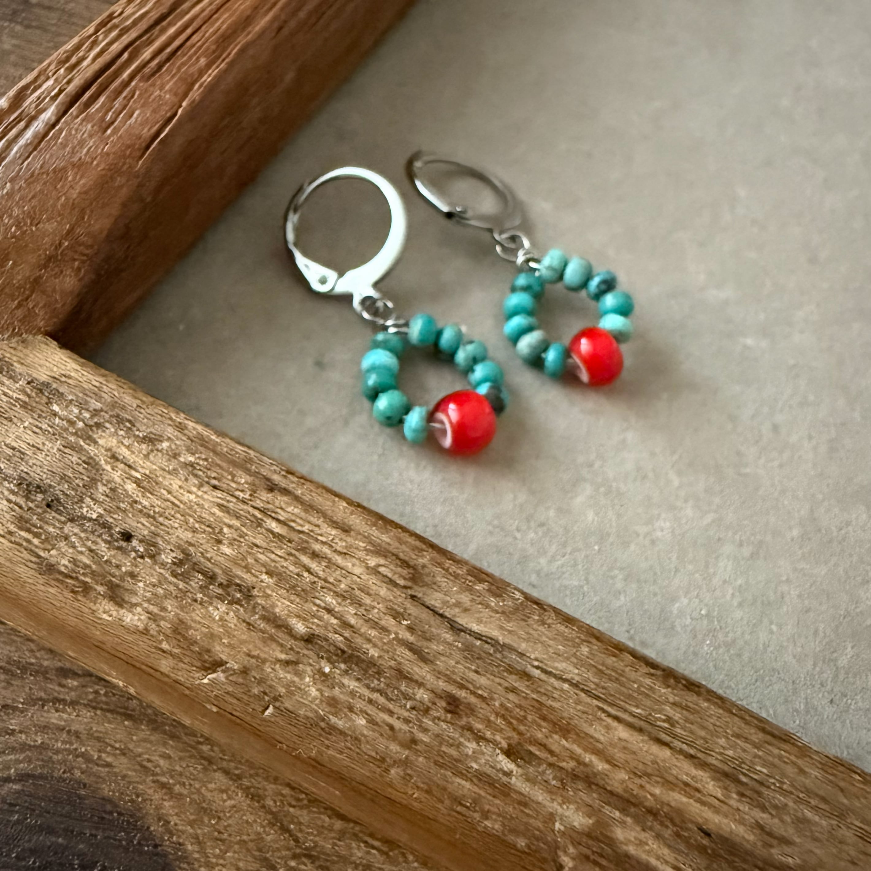 【サージカルステンレス:シルバー】ホワイトハーツビーズレッド×ターコイズ ピアス