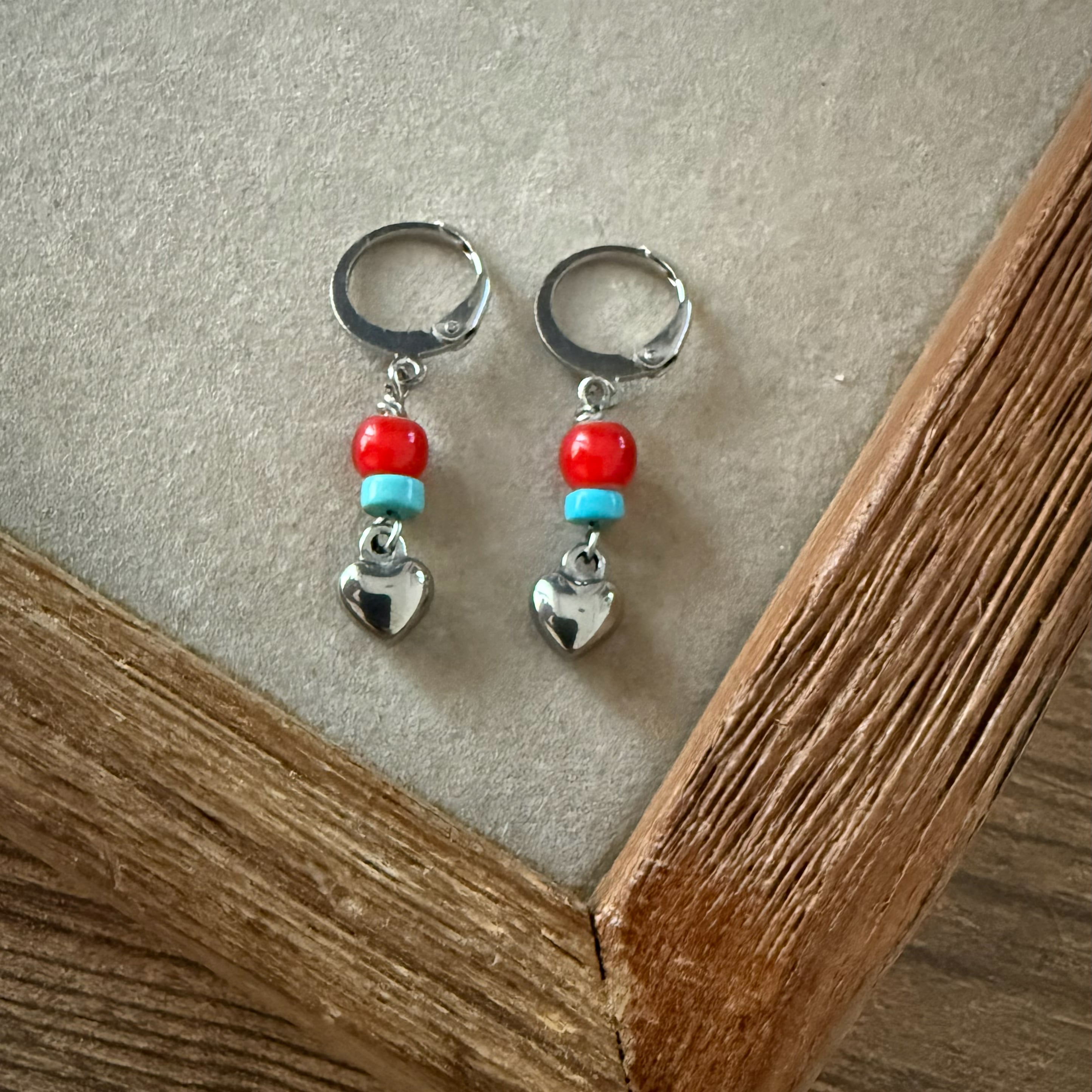 【サージカルステンレス:シルバー】ホワイトハーツビーズレッド×ターコイズ ピアス