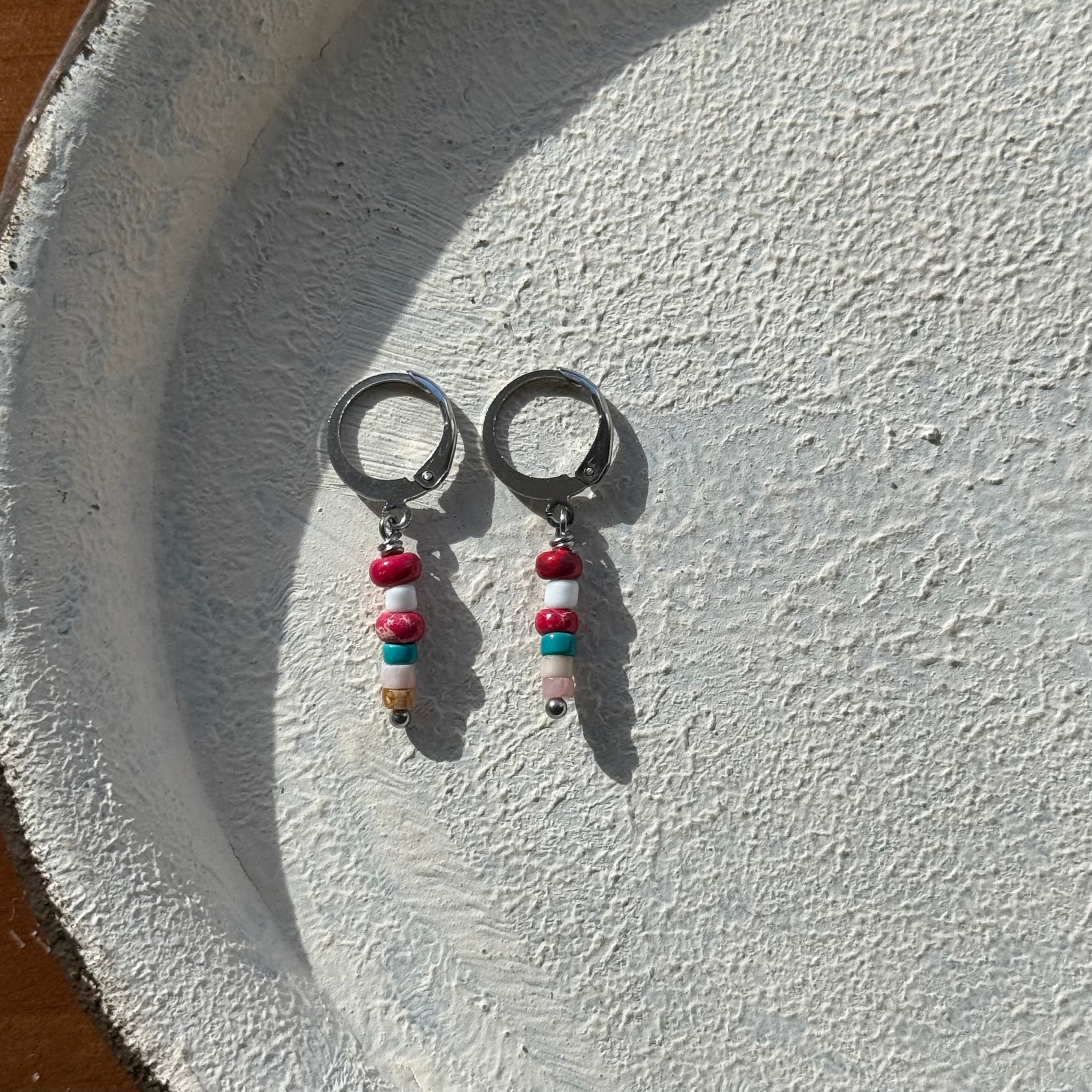 NC26058【サージカルステンレス:シルバー】レッドカラーカオリン×ピンクオパール×ターコイズ ピアス