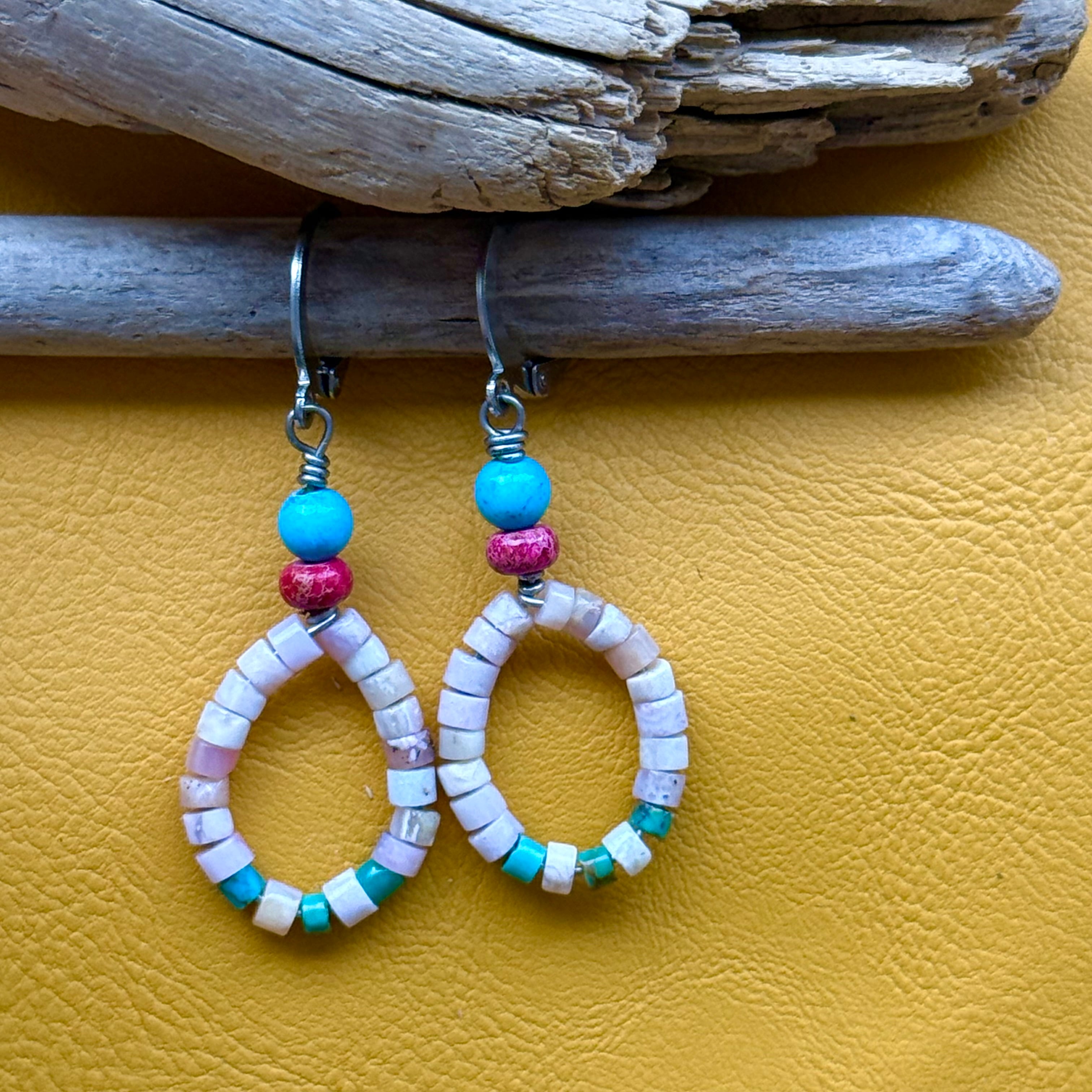 NC26062【サージカルステンレス:シルバー】レッドカラーカオリン×ピンクオパール×ターコイズ ピアス