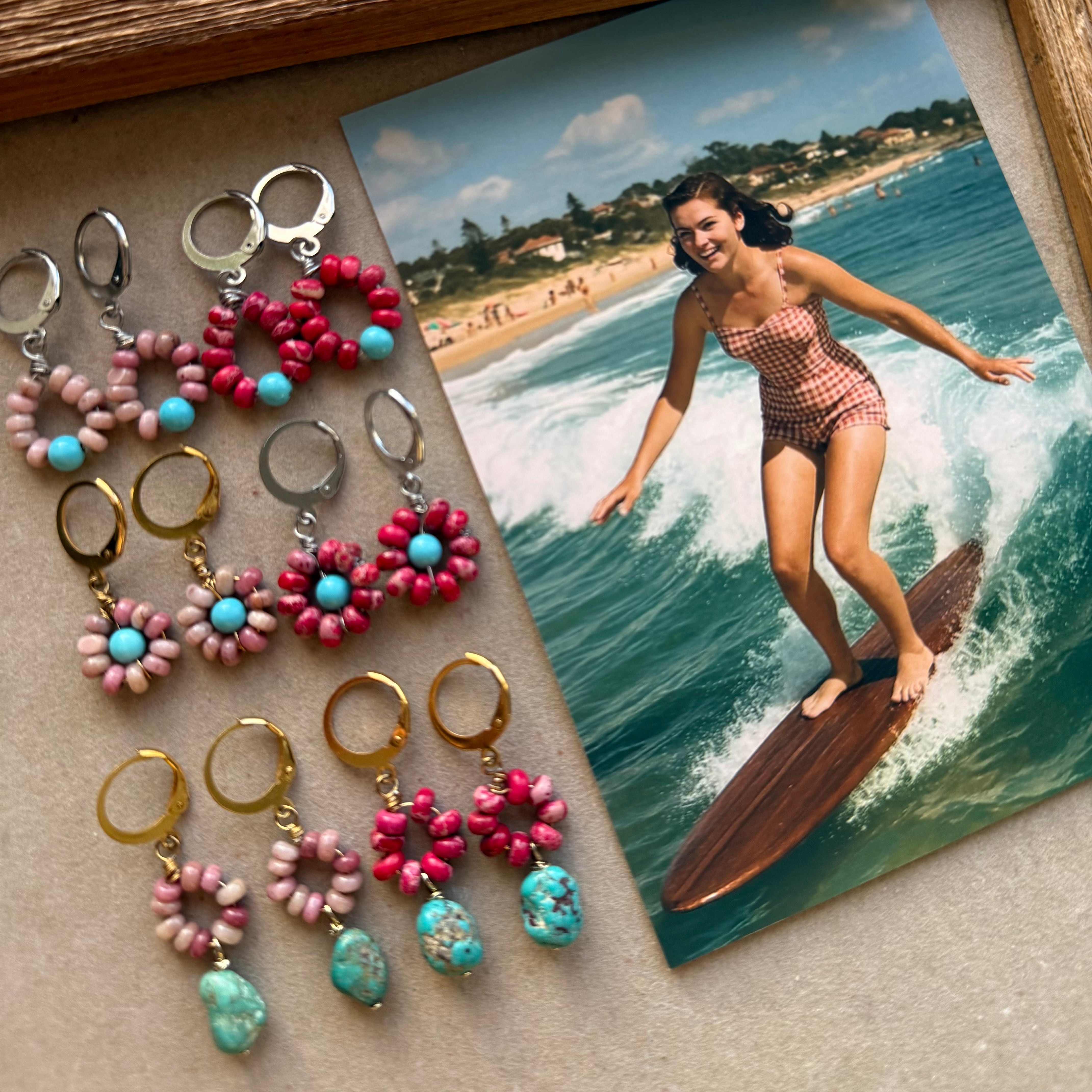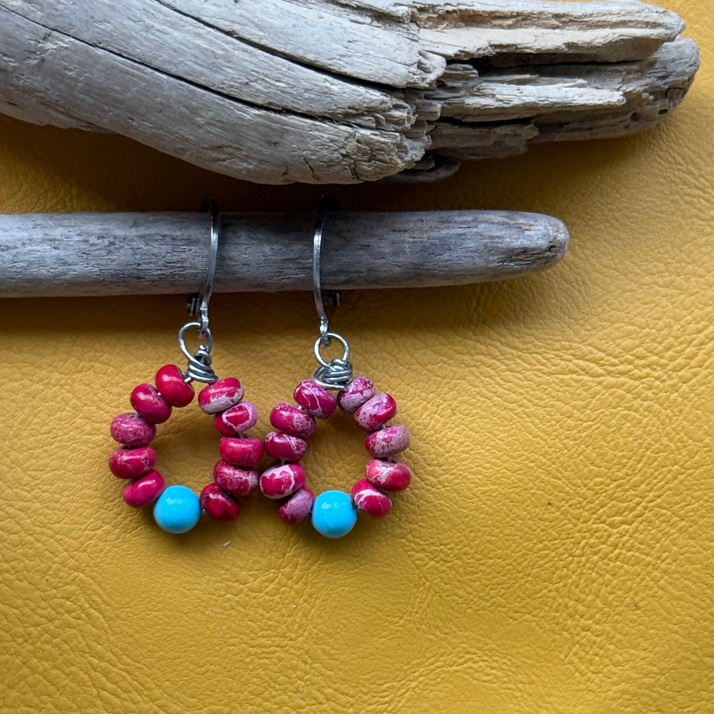 NC26069【サージカルステンレス:シルバー】レッドカラーカオリン×ターコイズ ピアス